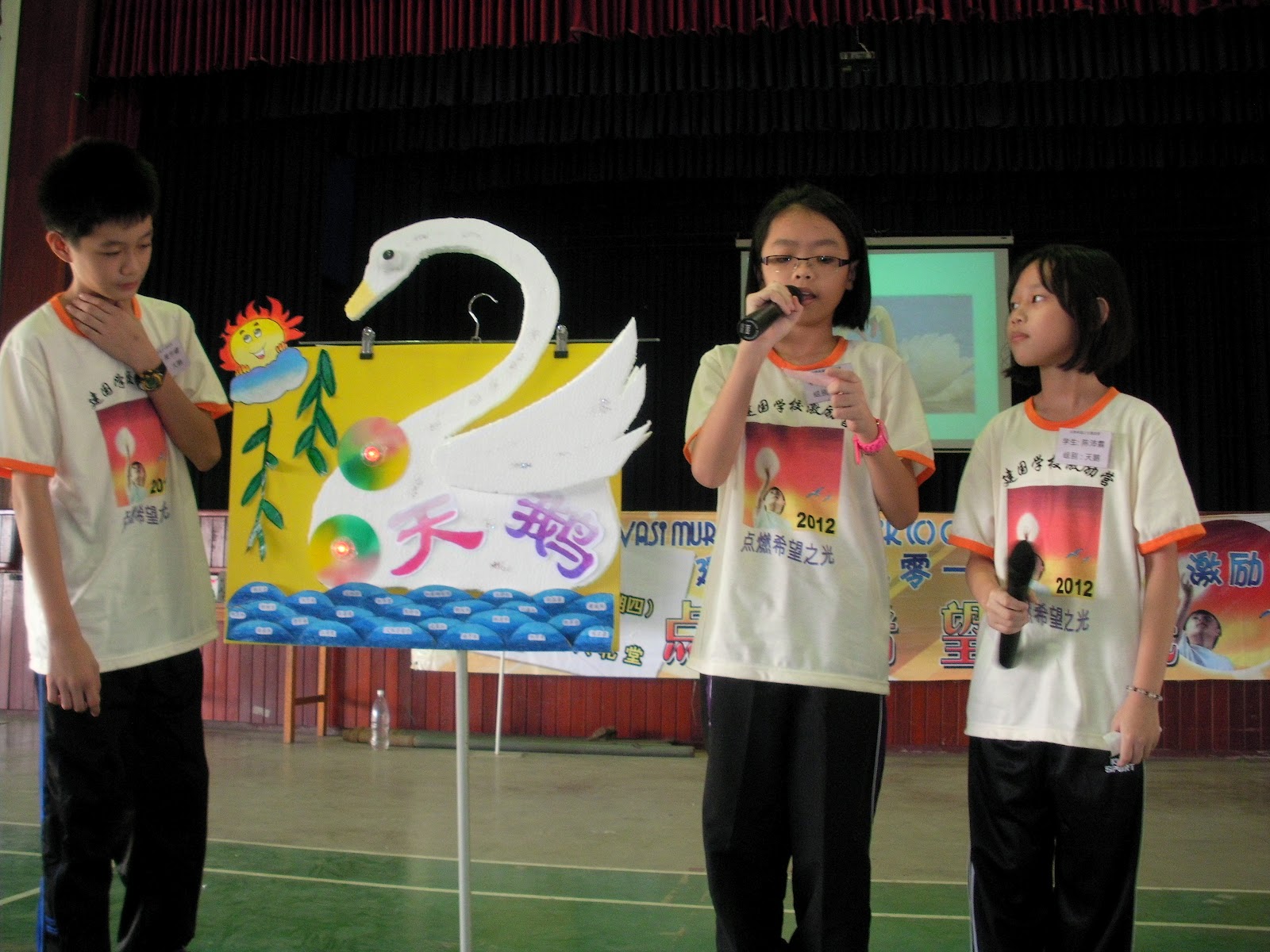 今年我们为该校学生的激励营定下【点燃希望之光】的主题,大家一起高高举起右手,大声地说:点燃希望之光、建国之光、华小之光。营会以各种大自然的美丽飞禽为队名,激发了师生们的想象,制作了令人叹为观止的队旗,当天还呈献了精彩的团队口号和队旗解说,不少同学的表演维妙维肖、令人激赏,整个过程,掌声不断,欢乐连连。